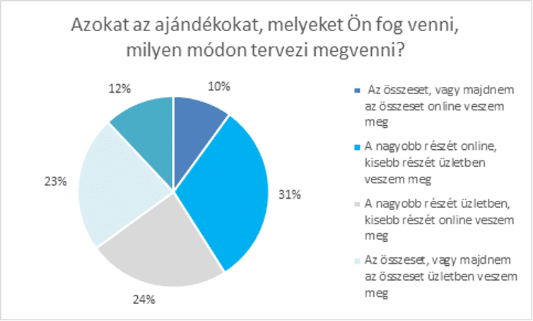 de csak 66% szán rá ugyanakkora összeget, mint máskor, és harmaduk (36%) kevesebb pénzt szán erre, mintha nem lenne a járvány. Az ajándékokra való átlagos költést 55 ezer forintra becsülték a válaszadók. Az online, illetve az üzletekben való ajándékbeszerzés terén nagyjából hasonló arányú a preferencia: összességében 41% vásárolna inkább online – 10% pedig kizárólag online –, és kicsit többen (47%) hajlanak inkább a személyes vásárlás felé. A válaszok alapján a fogyasztók igyekeznek elkerülni az utolsó pillanatban való vásárlást. Az online vásárlásoknál a válaszadók fele (54%) törekszik arra, hogy időben rendeljen, mert tart attól, hogy az ünnepi időszakban lehetnek fennakadások a kiszállításban. Az üzletben való vásárlásnál ennél kicsit kevesebb embert (43%) motivál az, hogy elkerülje a tömeget, és csak a harmaduk (31%) tartott attól a november eleji megkérdezés idején, hogy a járvány miatti esetleges korlátozások bevezetése – amelyekre azóta sor is került – miatt lehet nehézkesebb az ajándékbeszerzés.