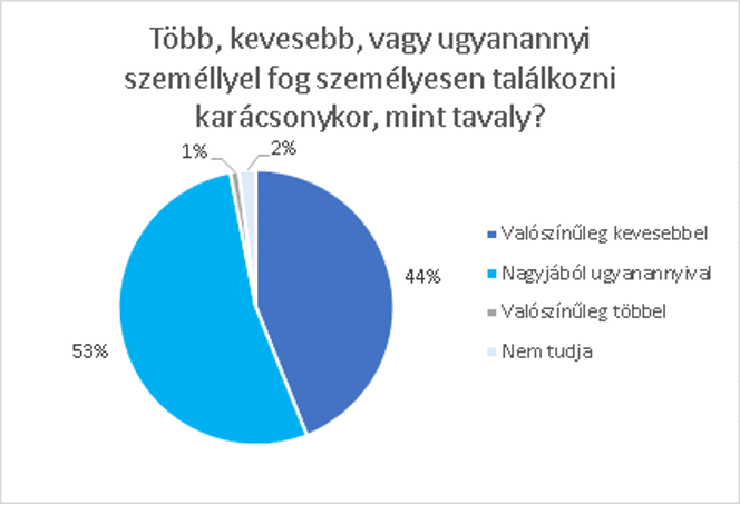 Abban megoszlottak a vélemények, hogy idén más lesz-e a karácsony, mint általában: valamivel több megkérdezett (58%) értett egyet ezzel az állítással, de viszonylag jelentős azok aránya (43%), akik szerint nem lesz érdemi változás az ünnepben. Hasonló a helyzet a tervezett találkozásokat illetően is: az adatfelvétel idején a megkérdezettek fele (53%) gondolta úgy, hogy ugyanannyi emberrel fog idén karácsonykor is találkozni, mint tavaly, de közel hasonló azok aránya (44%), akik kevesebb találkozást terveznek, aminek legfőbb (87%) okaként a járvány miatti óvatosságot jelölték meg. Szomorú adat, hogy az idei karácsony vesztesei az idősek lehetnek. Az idén kevesebb találkozást tervezők 49%-a – a teljes minta 18%-a – úgy gondolja, hogy leginkább az idősebb, nem közös háztartásban élő rokonokkal, szülőkkel, nagyszülőkkel nem fog találkozni.