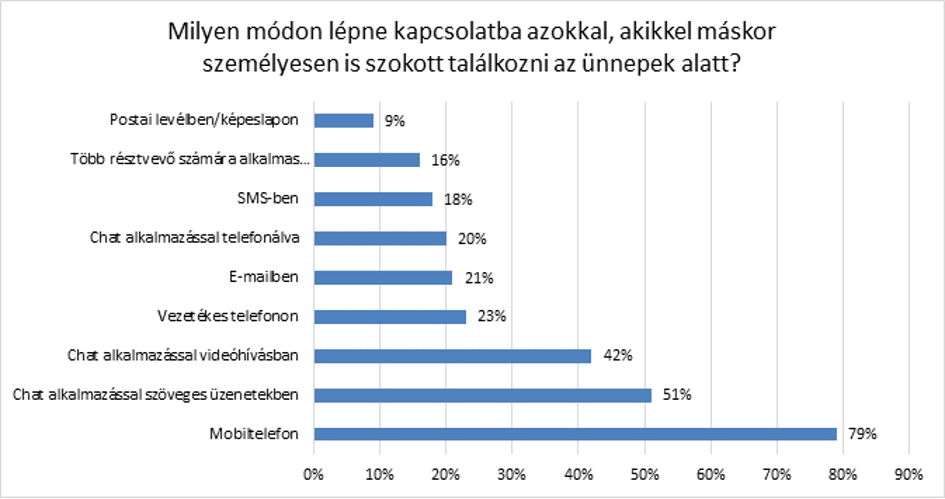 szinte minden 2. megkérdezett (48%) használ gyakrabban legalább egy ilyen applikációt vagy eszközt. Ha idén kevesebb is lesz a személyes találkozás, a kutatás szerint az emberek 75%-a tervezi, hogy karácsonykor valamilyen módon kapcsolatba lép másokkal, aminek legfőbb eszköze a mobiltelefon (79%) lesz, és jelentős a chat appok szerepe is. 51% küldene így szöveges üzenetet, és 42% használná videohívásra; a több fős, családi videohívás pedig a válaszadók ötödénél jön szóba az ünnepi kapcsolattartásra. Érdekesség, hogy csak a megkérdezettek 30%-a nincs benne valamilyen családi chat csoportban, és 41% régóta aktívan használja ezeket – mindössze 8% kezdte el a járvány hatására újonnan, vagy aktívan használni ezt a megoldást.