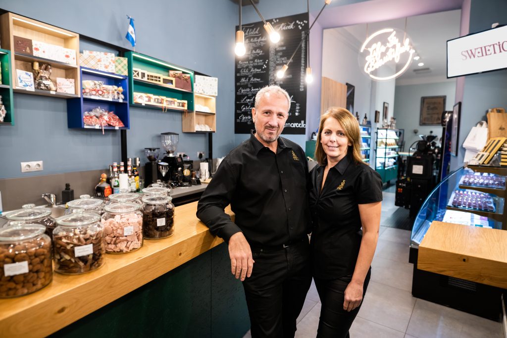 Mivel a Manufaktúránk székhelye Szigetszentmiklóson van, régóta vágytam rá, hogy eljussunk a pesti közönséghez is. 2020 novemberében megvalósult az álmom. A csokoládé manufaktúránk márkaboltja egyben egy speciality kávézó is, amely a Cafe Marcello-val való fúzió hatására jött létre. Jelenleg több mint 100 féle csokoládé vásárolható meg az üzletben, beleértve az összes eddigi díjnyertes bonbonunkat, cake-popunkat, drazsénkat, forró csokoládénkat és krémes karamellánkat is. A „csokoládé bár” mellett a Sweetic Buda a különleges kávéélményről is szól, ami az üzletbe lépve mindenki számáról azonnal kiderül a középen található szemet gyönyörködtető különleges kávépörkölő gépről és a semmivel se összetéveszthető illatról. A fővárosban egyedül itt kóstolhatnak a vendégek helyben pörkölt El Salvadorból származó kávékülönlegességet, ami ráadásul fair trade termék, melynek beszerzése során külön gondot fordítottunk arra, hogy közvetlenül a termelőktől érkezzenek a kávészemek.