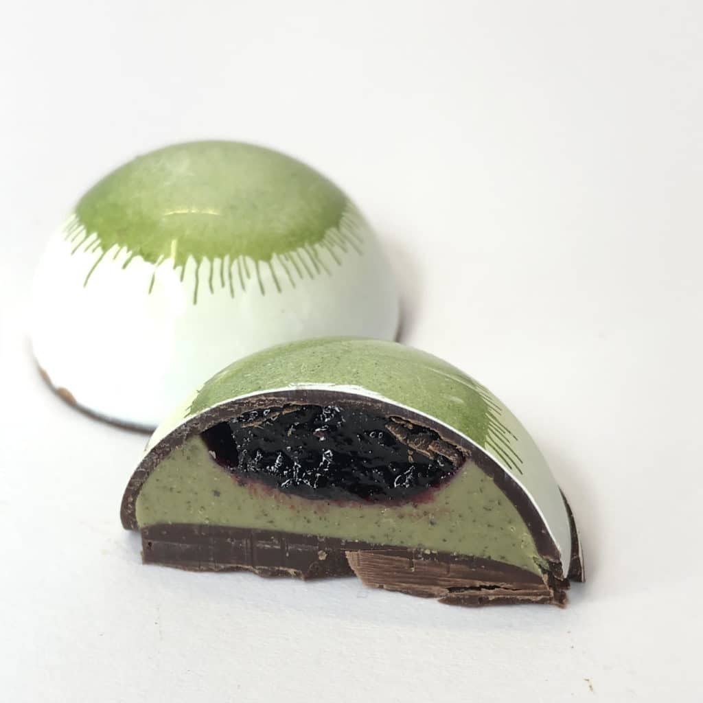 Igen. Erre nagyon büszke vagyok. 🙂 A tökmag-áfonya bonbonunk megkapta az Academy of Chocolate bronz díját, majd a gasztronómia Oscar-díjának is nevezett Great Taste Awards-on nyert elismerő két aranycsillagot. A fényesen csillogó bonbon belsejében kétféle töltelék található. A frissítő, kicsit édesebb áfonya nagyon jól harmonizál a remek minőségű tökmagkrémből készült réteghez, s mindezt, az ízvilághoz passzoló leheletvékony étcsokiburokba töltötték. A bonbon felületének játékos zöld, csodásan csillogó díszítése is az ízvilágot idézi. A nemzetközi gasztronómiai versenyeken a Sweetic két további alkotása is sikerrel járt:
