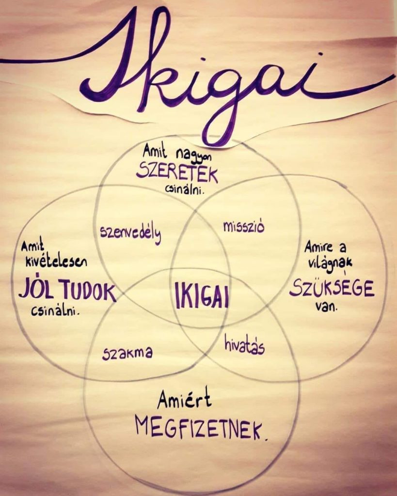 A boldogságra és a saját felelősségre visszatérve érdemes a időd legnagyobb részét “elfoglaló” munkával kezdeni, hogy ott találj örömöt. Az ikigai* (生き甲斐) japán fogalom. Jelentése: „a lét értelme”. A japánok szerint mindenkinek van ikigai-ja. A megtalálása mély és gyakran hosszú önismereti út által lehetséges. Nagyon fontosnak tartják, mivel hitük szerint ez hoz sikert és értelmet az életbe. Ennek megtalálása lenne a cél, hogy aztán ezt gyakorolva már nem dolgozol, hanem olyan tevékenységet végzel, amivel örömet szerzel másoknak, és ezáltal magadnak biztosítasz egy olyan életet, amit igazán szeretnél.