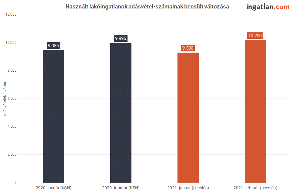 - Összesen 10.200 használt lakóingatlan adásvételére kerülhetett sor februárban az ingatlan.com becslése szerint, ami 2 százalékkal haladja meg az egy évvel korábbit és 9,6 százalékkal több az idén januárra becsült adásvételek számánál.