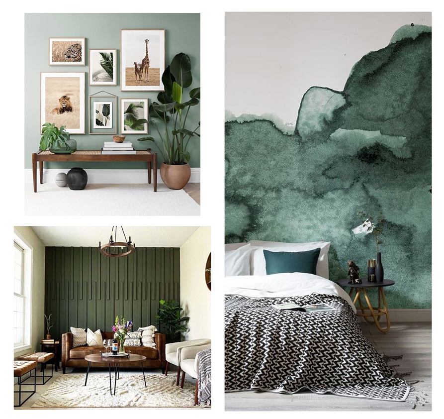 Talán a legkézenfekvőbb módszer a zöld használatára a falfesték, amelyből számtalan árnyalat létezik. Például az eukaliptusz, a zsálya, az olíva, levélzöld, és még sok más, pedig vannak egyéb lehetőségek is, mint például a jobb oldali nagyobb képen egy különleges zöld-fehér színű tapéta használata vagy a bal alsó képen, ahol sötétzöld fali panelekkel dobták fel a nappalit.