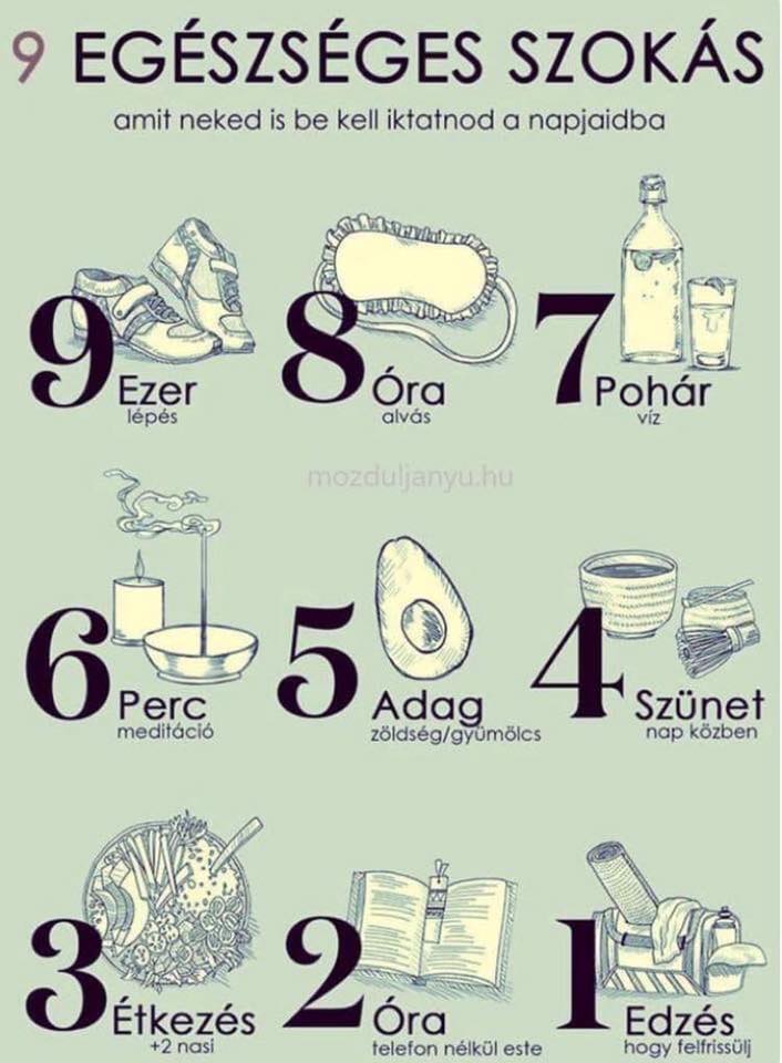 8 óra alvás – igen, tudom, ez sem mindenkinek 8 óra, én is általában 6-ot alszom, és a lefekvés és felkelés ideje is egyéni, érdemes megfigyelni, kinek mi a számára legmegfelelőbb..