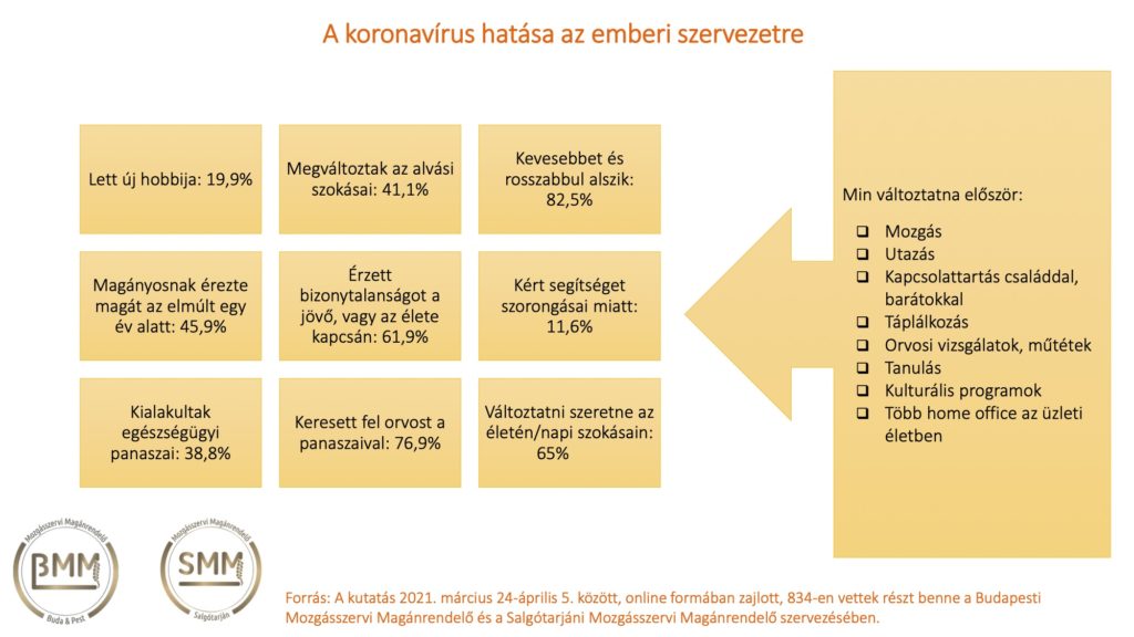 A testsúlynövekedéssel a magyaroknak is meggyűlt a baja: minden harmadik személynek nőtt a súlya, a legtöbben 2-5 kg (25%), míg a megkérdezettek 13%-a 6-9 kg pluszsúlyról számolt be. A korlátozások miatt idehaza is csökkent a mozgási hajlandóság, sokan lemondtak a sport örömeiről otthonaik fogságában: a megkérdezettek 63%-a kevesebbet mozgott a vírus kezdete óta és 43%-uk több időt töltött semmittevéssel. Nem véletlen, hogy a fentiek miatt nőtt a mentális- és mozgásszervi panaszok száma: 82% egy éve rosszabbul alszik, 45% érezte magányosnak magát, de csak kevesen kértek bárkitől segítséget (11,6%). A megkérdezettek 65%-a tervezi, hogy a korlátozások feloldásával változtat az életén: több mozgás, utazás, családi- és baráti látogatások, kulturális programok, elhalasztott orvosi vizsgálatok, vagy műtétek szerepelnek a magyarok kívánságlistáján.