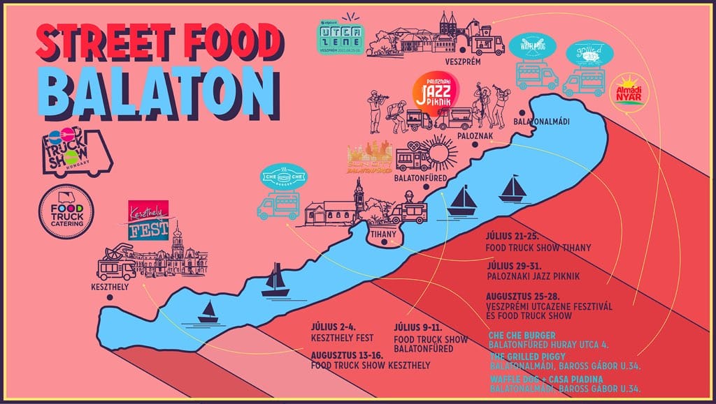 Az ország legjobb food truck-jai júliusban és augusztusban levonulnak a Balaton köré. A korábbi évekhez hasonlóan mennek Paloznakra, Veszprémbe, idén lesz egy bázisuk Balatonalmádiban, és fesztiváloznak Keszthelyen, valamint Füreden is. Tihanyban, a Placcon egy egész hetes piaccal egybekötött esemény lesz a nyár közepén, az augusztus 20-i eseménysorozaton pedig a veszprémi utcazenével együtt Food Truck Show-t rendeznek. „Összesen 95 autó vesz részt a balatoni rendezvényeken, emellett 40-50 kocsi fixen leköltözött a legforgalmasabb strandokra. Úgy 200 ezer vendéget várunk az eseményeinkre” – foglalta össze számokban az idei évet V. Horváth Zoltán főszervező.