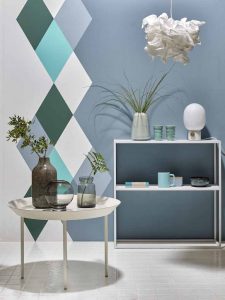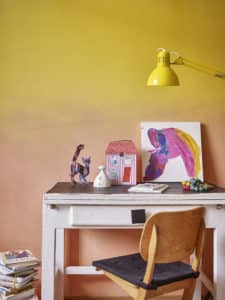 Különböző „nyáridéző” mintákat is alkothatsz a falakra, a sárgát kombinálhatod más színekkel is – a rózsaszínek, szürkék, barnák és kékek különösen jól állnak neki. A minták elkészítéséhez használhatsz maszkolószalagot, amelynek segítségével geometriai mintákat festhetsz, de különböző – saját kezűleg készített vagy készen vásárolt – stencilekkel is egyedi dekorációt alkothatsz.