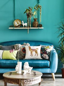 Néd, milyen vidám ez a türkizkék színű kanapé egy türkiz zöldes falszín árnyalattal párosítva, melyhez különböző mintájú párnákat adtak. Jól passzolnak ehhez a kombinációhoz a neutrális színek is. Én itt kicsit Dél-Amerikai hangulatot érzek. 🙂