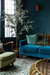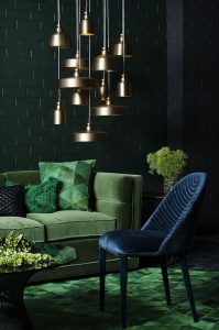 Ebben az enteriőrben nagyon sötét a fal, ami úgy vettem észre, hogy külföldön menőbb. Mi magyarok inkább a világosabb színekre megyünk, de ha bevállalós vagy láthatod, hogy milyen jó kontrasztot alkot a zöld kanapéval és szőnyeggel, illetve a kék székkel. A fém anyagú lámpák felrakják a pontot az i-re, így nagyon elegáns lesz. Hajrá! 🙂