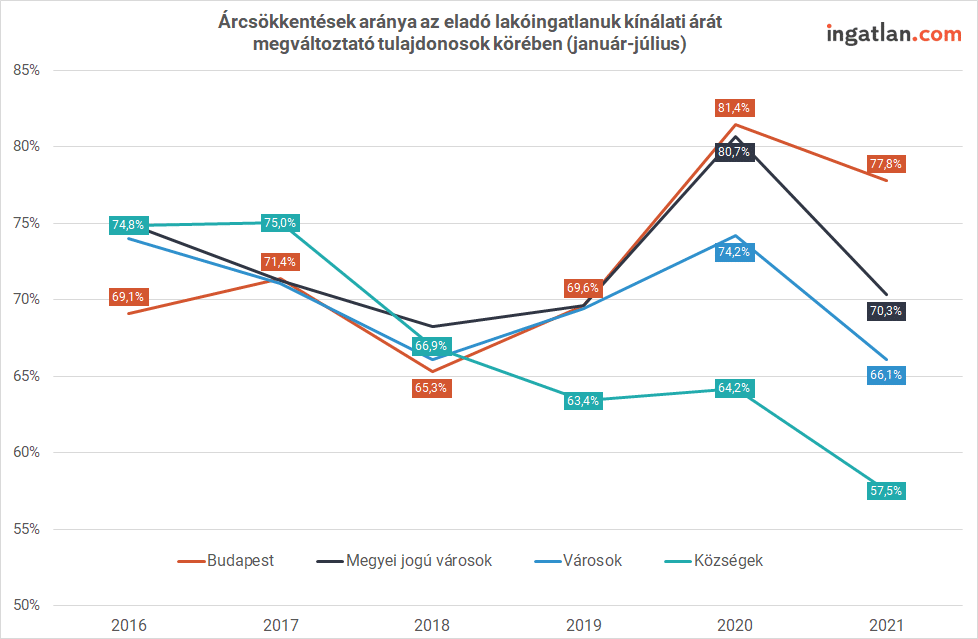 - Az ingatlan.com adatai szerint a budapesti lakásuk eladása során árat változtató tulajdonosok 80 százaléka mérsékelte a kínálati árat 2020-ban és az idén is, ami rekordmagas arányt jelent.