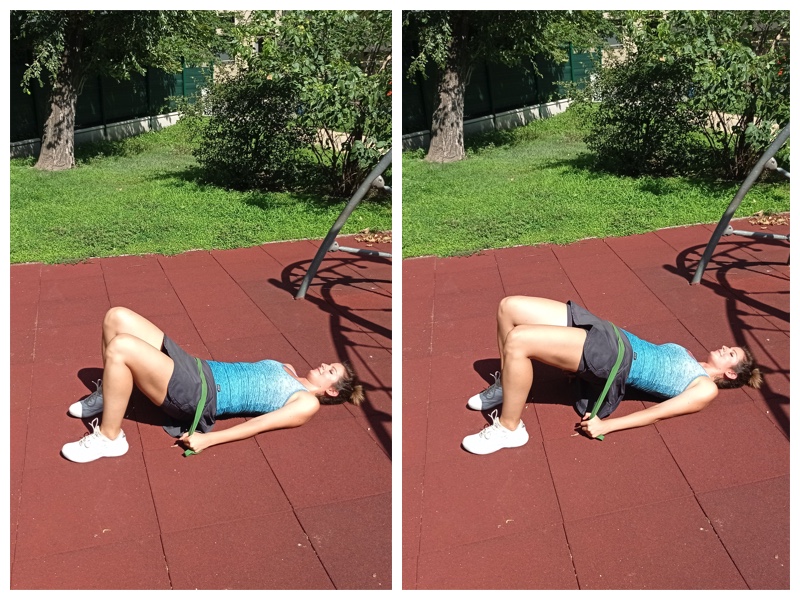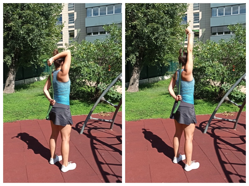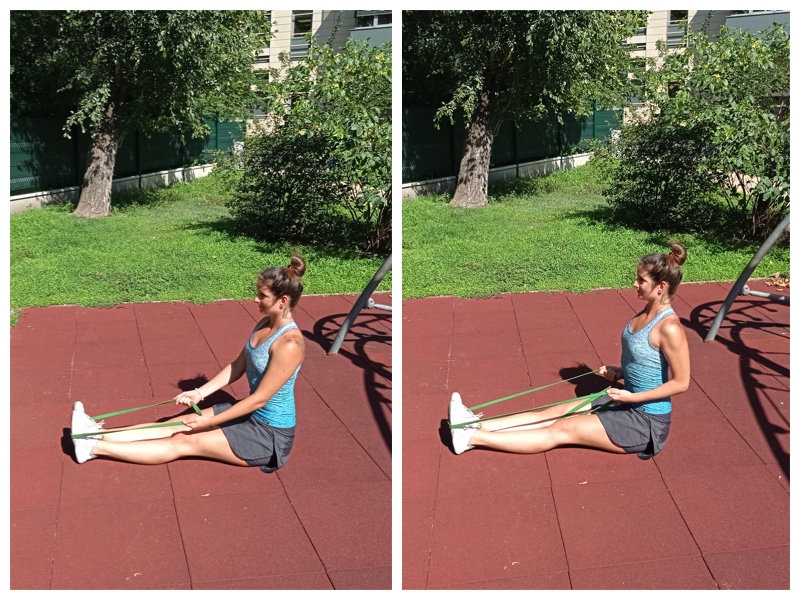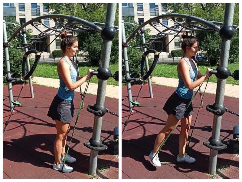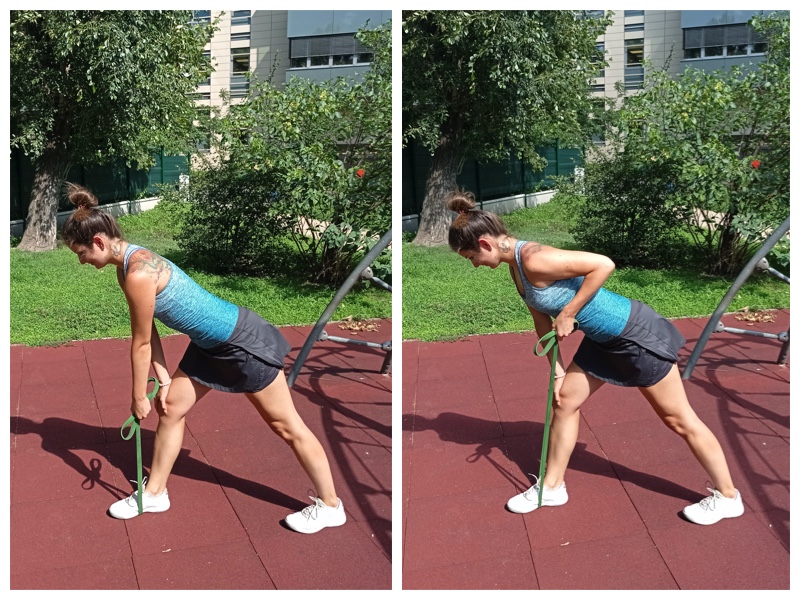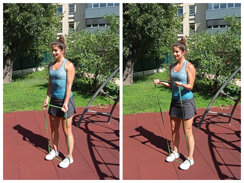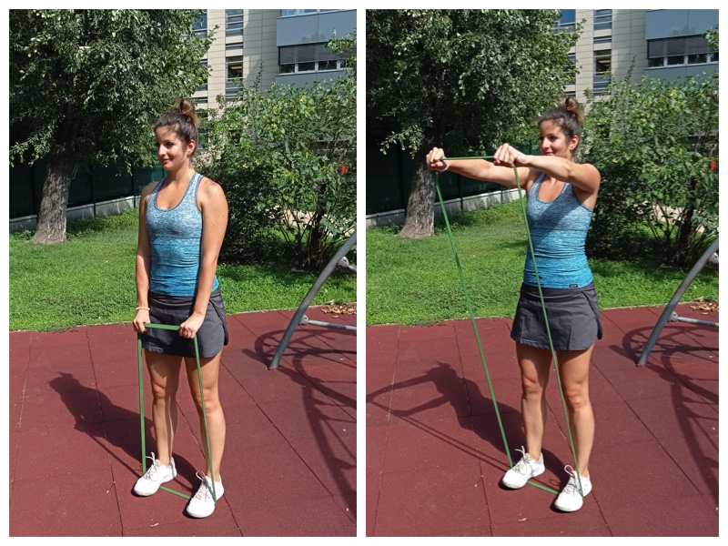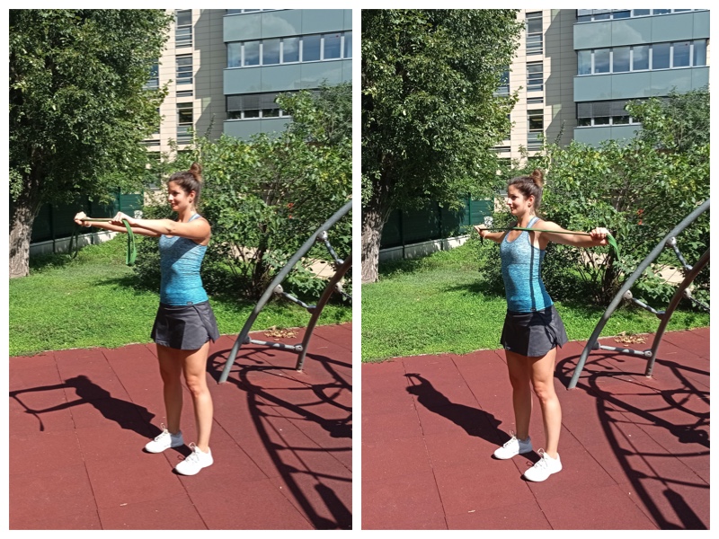 A lapockákat koncentráltan zárjuk, karok enyhén hajlítva. Szalag test előtt, karok mellső középtartásból oldalsó középtartásba.