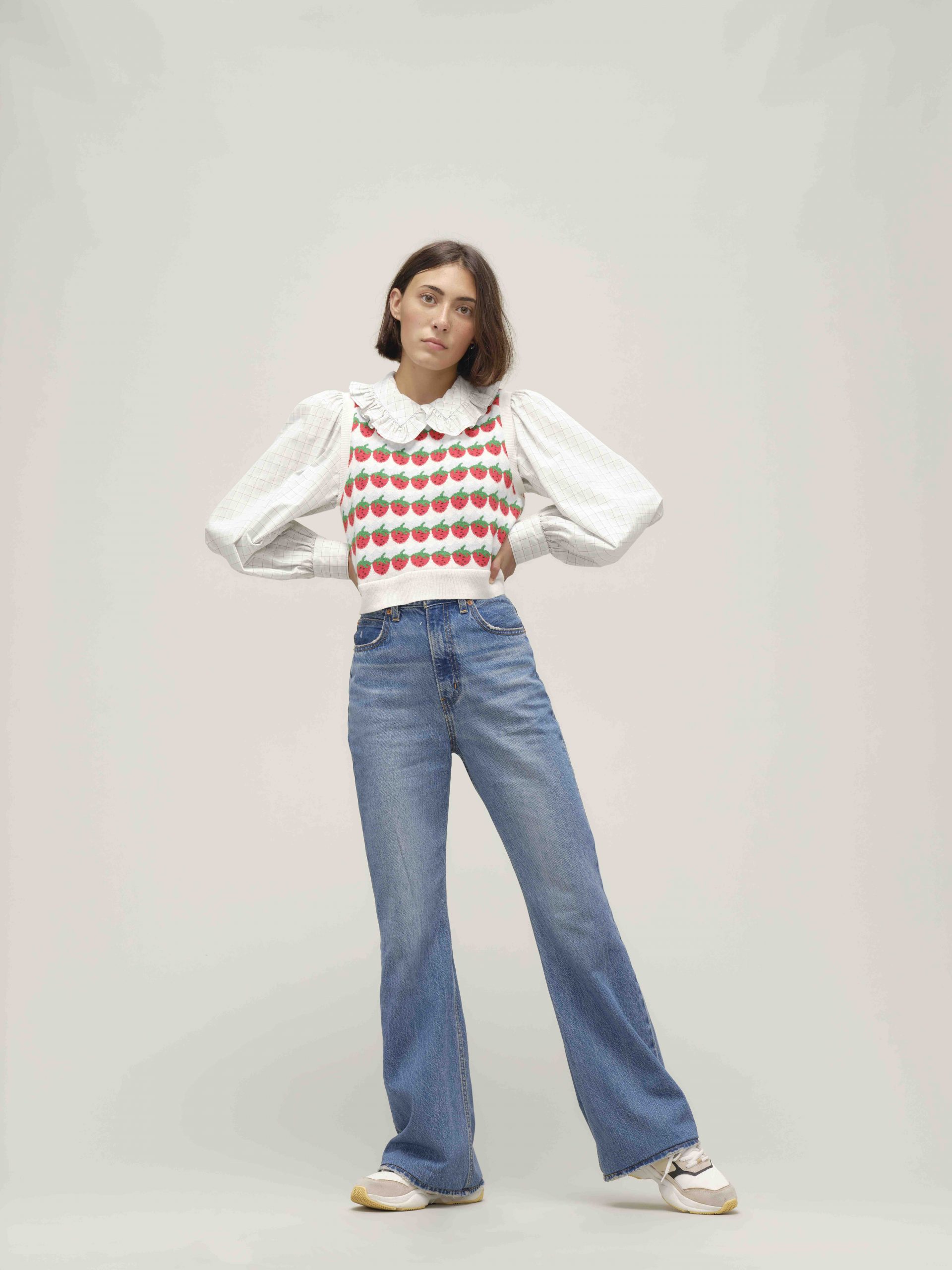 Azoknak, akik karcsúbb, tisztább lookra vágynak, ajánljuk a ‘70s High Straight farmert, amely ugyanolyan magas derekú és cipzáros, de a szára egyenes és kevéssel a cipő felett végződik.