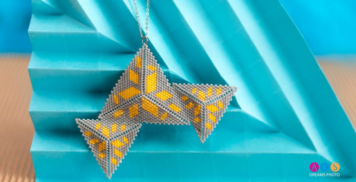 Ezüst nyaklánc és fülbevaló szett. Az ezüst tetraéderek térbeliségét hangsúlyozza a megvilágítás, nyújtott árnyékokkal, letisztult dekorációval.
