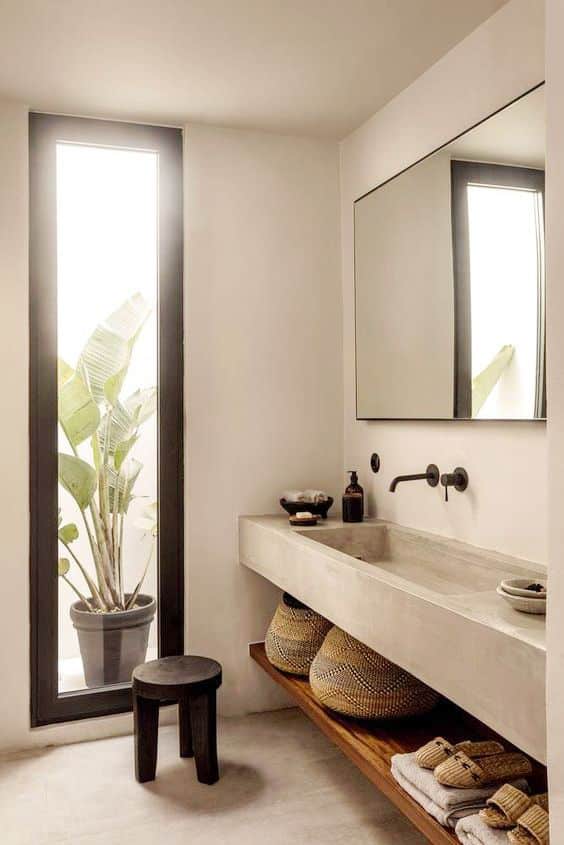 A fürdőszobai egyszínű falat és mosdópultot feldobja a sötét színű ablakkeret az ülőkével és a fa anyagú polc használata.