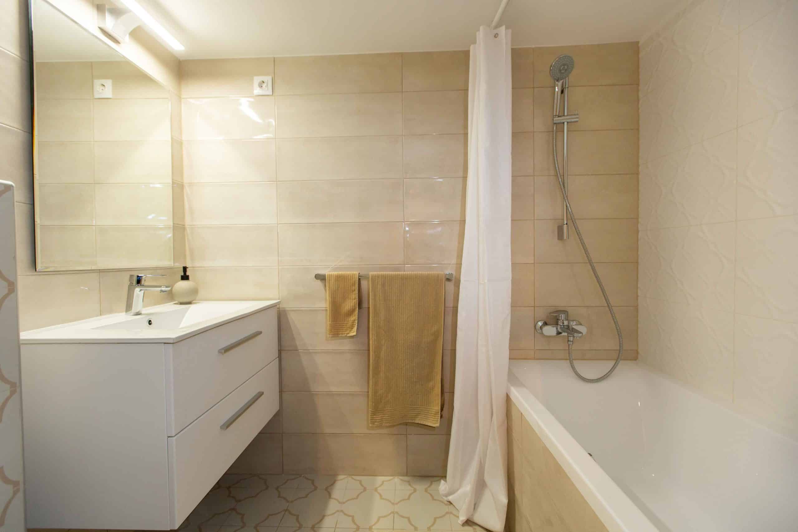 Az előző fotón kontrasztos fürdőszobát mutattam, itt pedig a fehér és a bézs a domináns, illetve a mintás járólap visz játékosságot a helyiségbe.