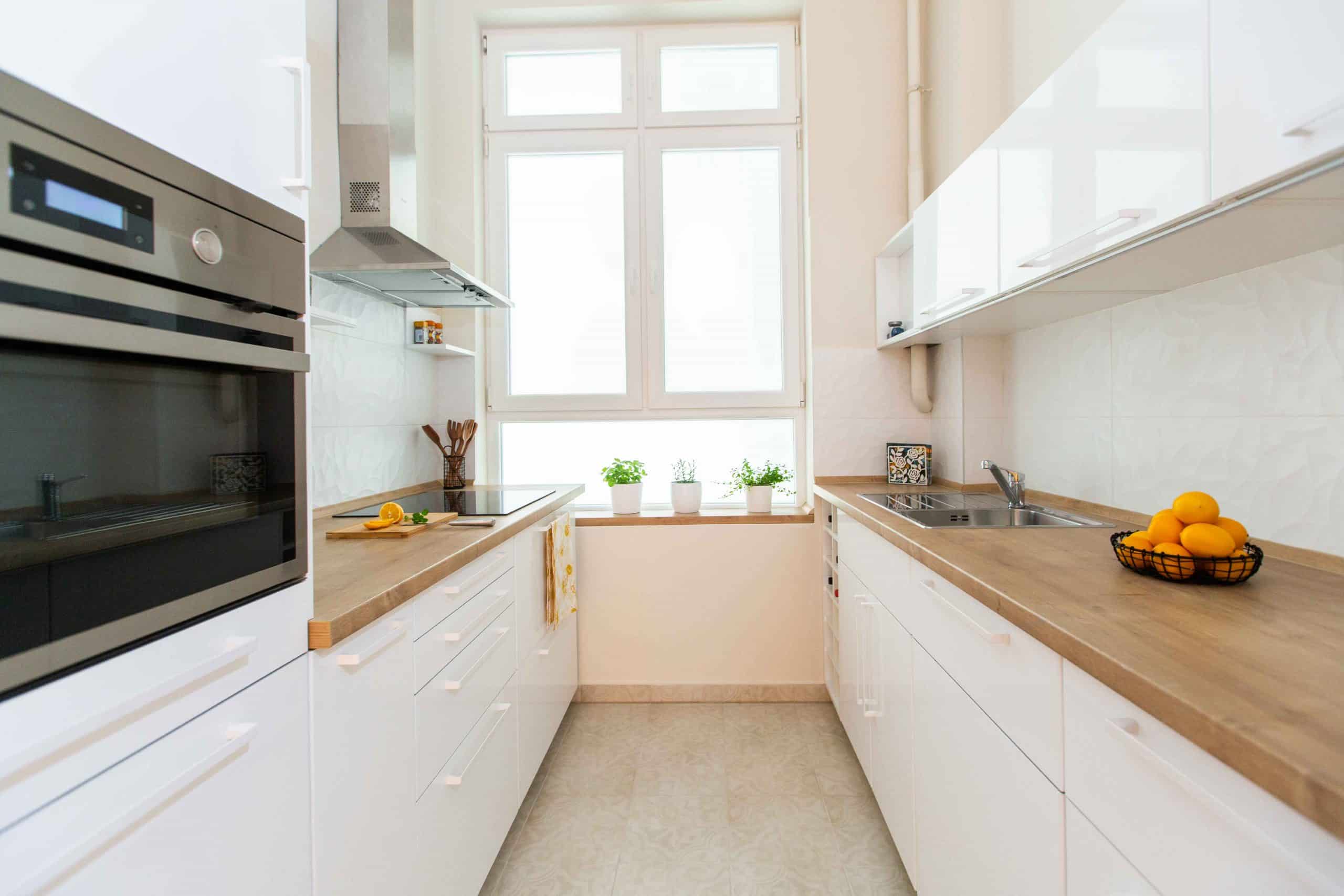 Fehér konyhabútor krémszínű falakkal és fa munkapulttal kombinálva. A szürke mintás járólap kiemeli a bútor fehérségét, mégsem kelt hideg hatást.