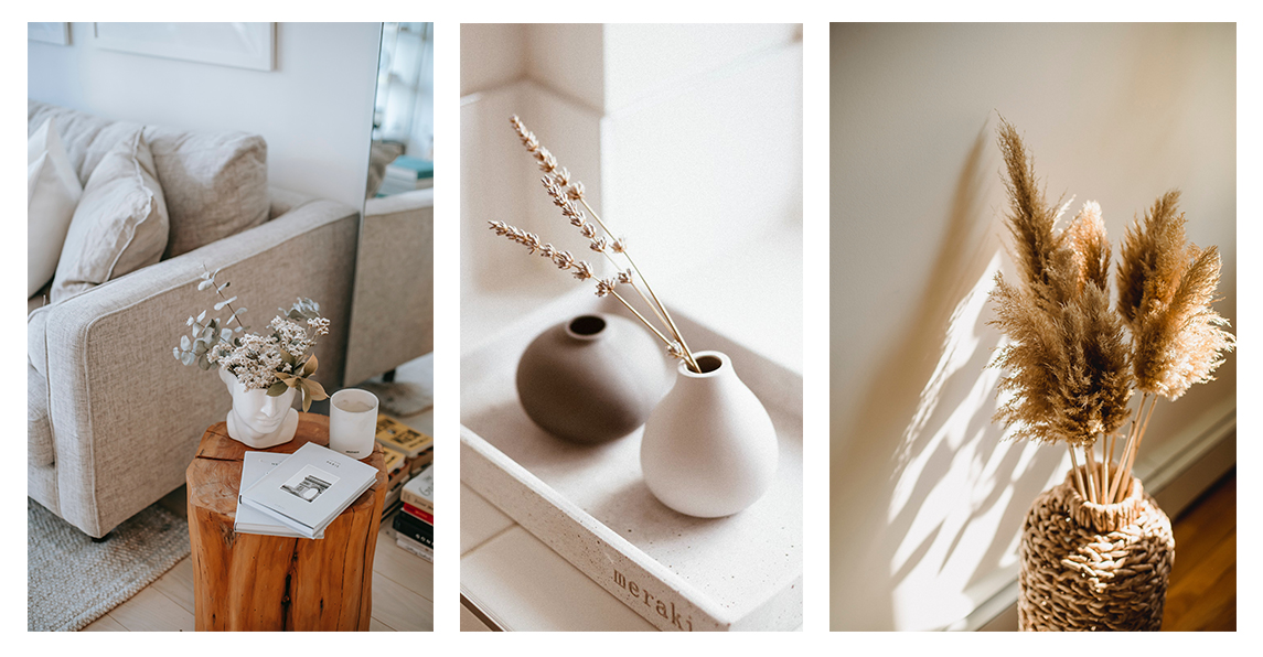 Száraznövény dekorációs ötletek natúr színű otthonba.