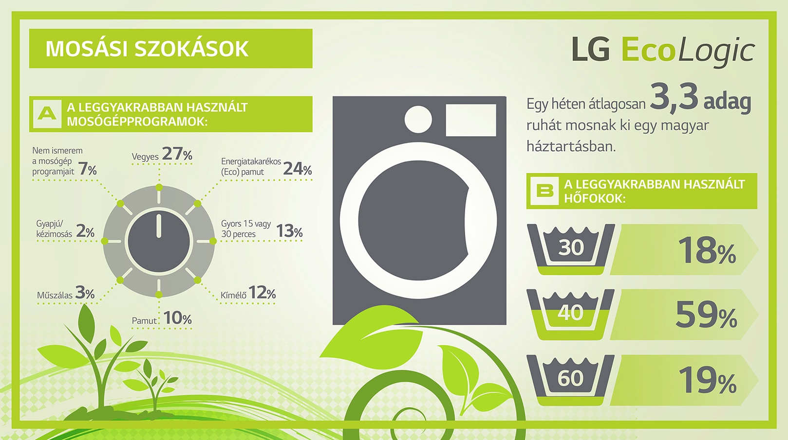 A magyar háztartások a leggyakrabban a vegyes és az energiatakarékos (eco), a legritkábban a gyapjú/kézi mosás programokat használják, a mosási hőfok tekintetében pedig a 40 fok számít a legkedveltebb beállításnak. Az ennél magasabb hőfokra főként a 30-39 éves, gyereket nevelő felnőttek esküsznek, míg jobbára csak a legfiatalabbak, vagyis a 18-29 éves korosztály fogadja el azt, hogy akár 30 fokon is megfelelő eredményt nyújt a készülékük.