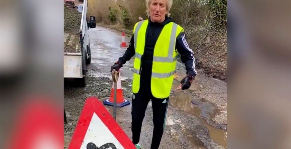 Az állam nem foglalkozott vele, így a még mindig nagyon aktív 77 éves Sir Rod Stewart neki állt sajátkezűleg eltüntetni a kátyúkat otthonának közelében.