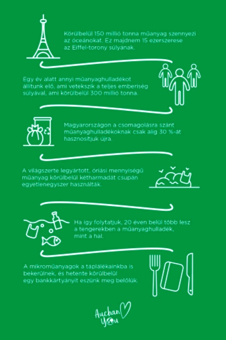 Az Auchan azt vallja, hogy az élelmiszeriparnak és kereskedelemnek felelőssége és szemléletformáló hatása is van a környezettudatosság kialakítására. Az Auchan Magyarország ezért évek óta egy nagyon határozott és következetes fenntarthatósági stratégiát valósít meg. 2019 óta, amikor elsőként jelent meg a piacon a mára már ikonikusnak számító újrahasznosított karton bevásárlódobozával, folyamatosan hozott be alternatív csomagolóeszközöket a zöldség-gyümölcsosztályra, a pékáru részlegre, legutóbb pedig a húsoknál és sajtoknál is lecserélték a műanyagot tartalmazó csomagolást 100%-ban növényi alapanyagokból készülő, lebomló és komposztálható változatokra. Legújabb lépéseként pedig teljesen kivonja az egyszer használatos műanyagzacskókat az üzletekből.