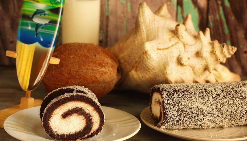 A barna rész valamennyi hozzávalóját turmixgépben vagy késes aprítóban sima masszává dolgozzuk. Két sütőpapír közé téve a masszát 40×25 centis téglalappá nyújtjuk. Rásimítjuk a fehér részt, amihez szintén valamennyi hozzávalóját turmixgépbe vagy késes aprítóba téve krémesítjük. Szorosan feltekerjük (az alatta lévő sütőpapír segítségünkre lehet a tekerésnél). Belegörgetjük a kókuszba, és 3-4 órára, még jobb, ha egész éjszakára hűtőszekrénybe tesszük, mielőtt szeletelnénk.
