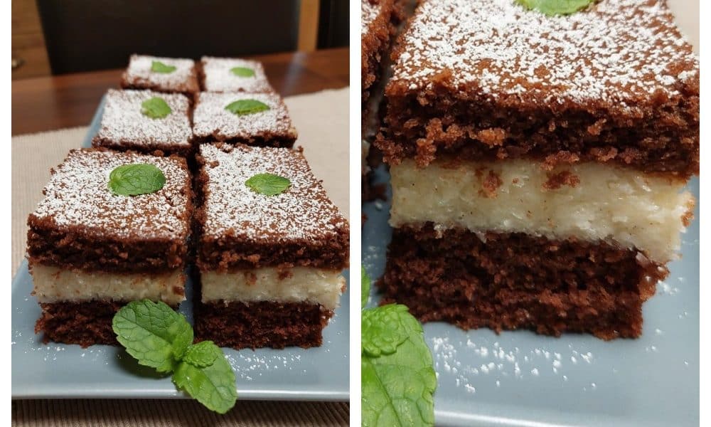 Közben a második adag tésztát rárakjuk a kókuszos rétegre, és kb. 25 percre visszatesszük a sütőbe. Kihűtjük és úgy szeleteljük. Porculorral megszórva,vagy csokival leöntve tálaljuk.