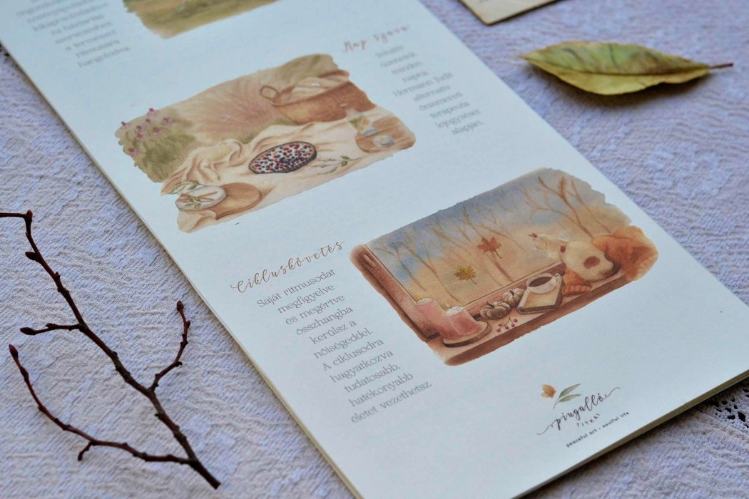– Megtalálhatjuk benne a „nap szavát”, ami az intuitív énünkhöz visz közelebb. Minden naphoz adott egy szó, melyeket Hermann Judit, alternatív önismereti terapeuta jegyzett le a Nap és a Hold „titkait” fejtegetve. Ha befelé figyelve ízlelgetjük ezeket a „sugallatokat”, érzékenyebbé válunk az utat mutató, finom belső hangunkra. Van benne lehetőség a ciklusunk követésére. A saját ritmusunkat megfigyelve és megértve összhangba kerülünk a nőiségünkkel, és rá hagyatkozva nemcsak tudatosabb, de hatékonyabb életet vezethetünk. Végül tartozik hozzá egy zsebkártya, melyet magunknál hordhatunk, és segít fókuszban maradni, valahányszor felpörögnek az események. A hónaphoz tartozó illusztrációkat nézegetve pedig máris nyugodtabban ver a szívünk.