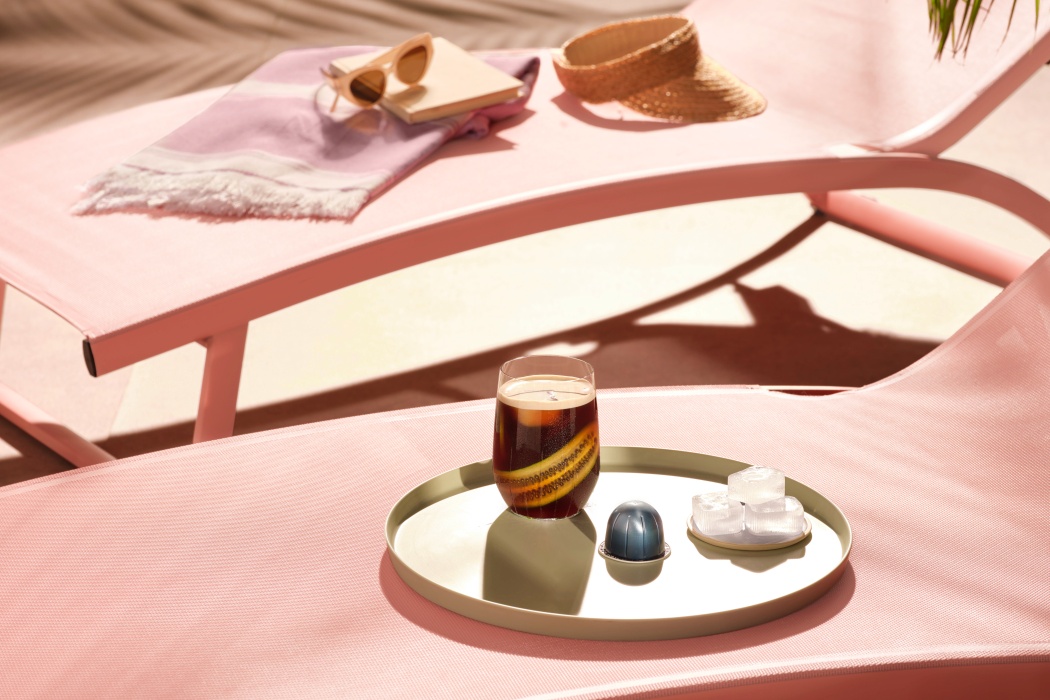 2. Készítsünk el 355 ml Nespresso Vertuo Cold Brew Style Intense kávét, és töltsük rá a pohár tartalmára.