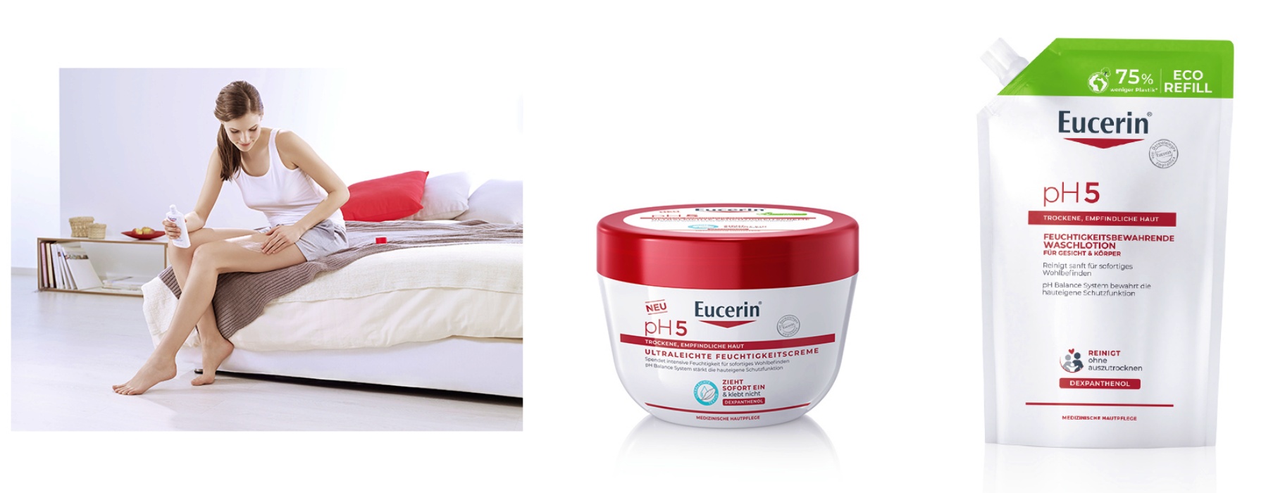 Az érzékeny bőr problémája mellett az Eucerin a klímaváltozással járó környezetvédelmi kihívásokat is a vállára vette, s a fenntarthatóbb jövő érdekében újragondolta a termékeinek előállítását, gyártását és csomagolását. A fenntarthatóság felé vezető útján nagy előrelépés volt, amikor sikerült az Eucerin pH5 termékcsaládjának a formuláit, csomagolást egyaránt továbbfejlesztenie. Ezáltal minden pH5 formula 100%-ban mikroműanyag-mentes, így a termékeik nemcsak a bőrhöz gyengédek, hanem a környezethez is. Átlátszó flakonjaik 99%-ban újrahasznosított PET-ből készülnek (kivéve a címkét és a kupakot), valamint 400 ml-es utántöltő tasakjai 65%-kal csökkentik a műanyagfelhasználást, így 41.2%-kal redukálja a CO2e-kibocsátást. Ezenfelül a termékcsaládban a 100%-ban klímasemlegesített utántöltőket és RPET flakonokat is megtalálhatjuk.