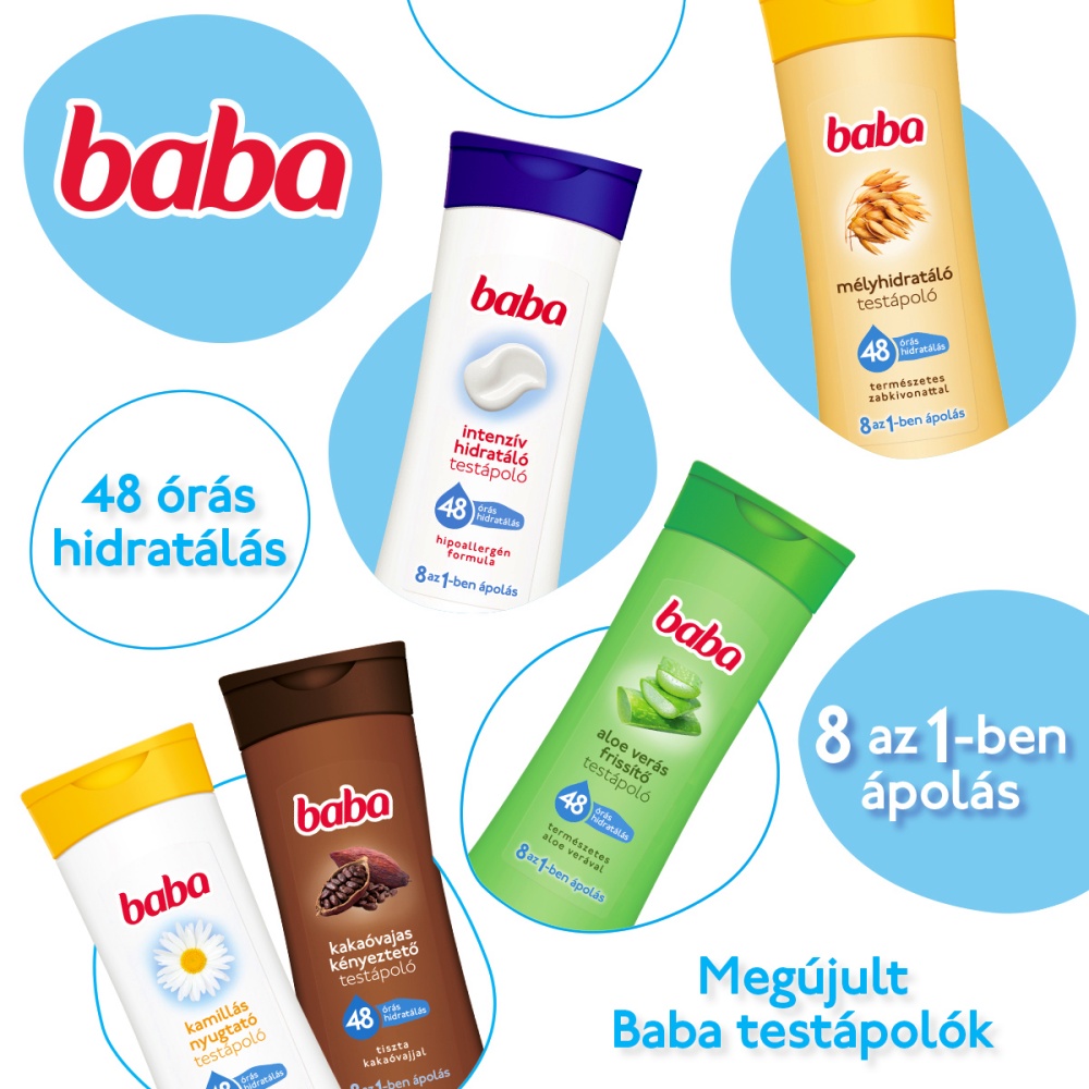 Megújult a Baba testápoló család, amelynek tagjai 8 az 1-ben ápolást nyújtanak és 48 órán keresztül fejtik ki hatásukat, miközben kellemes, puha bőrérzetet biztosítanak. Hidratáló anyagokat tartalmazó formulájuk nem zsíros, könnyen kenhető és gyorsan beszívódik, használat után a bőrrel együttműködve pedig segít a ceramidok előállításában és a bőr természetes védőrétegének megerősítésében.