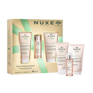 - HUILE PRODIGIEUSE TÖBBFUNKCIÓS SZÁRAZOLAJ – ARCRA, TESTRE, HAJRA (100ml): Hét különböző tápláló növényi olaj kombinációját tartalmazó száraz olaj. (Az édesmandula olaj nyugtatja a bőrt, a kamélia olaj antioxidáns tulajdonságú, a borágó olaj ránctalanító, feszesítő hatású, a makadámdió olaj tápláló, a mogyoró olaj hidratáló, az orbánc olaj bőrnyugtató, az E-vitamin pedig szintén antioxidáns, bőrvédő hatású, így teljesen egyedülálló regeneráló és tápláló hatása van a bőrre. A NUXE Huile Prodigieuse szárazolaj megakadályozza, halványítja a terhességi csíkokat és a striákat, a dekoltázst is gyönyörű feszessé varázsolja.