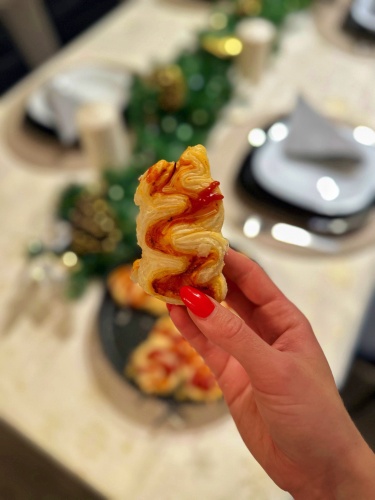 - A csíkokat hajtogatva karácsonyfát formázunk, majd beleszúrjuk a húspálcát.