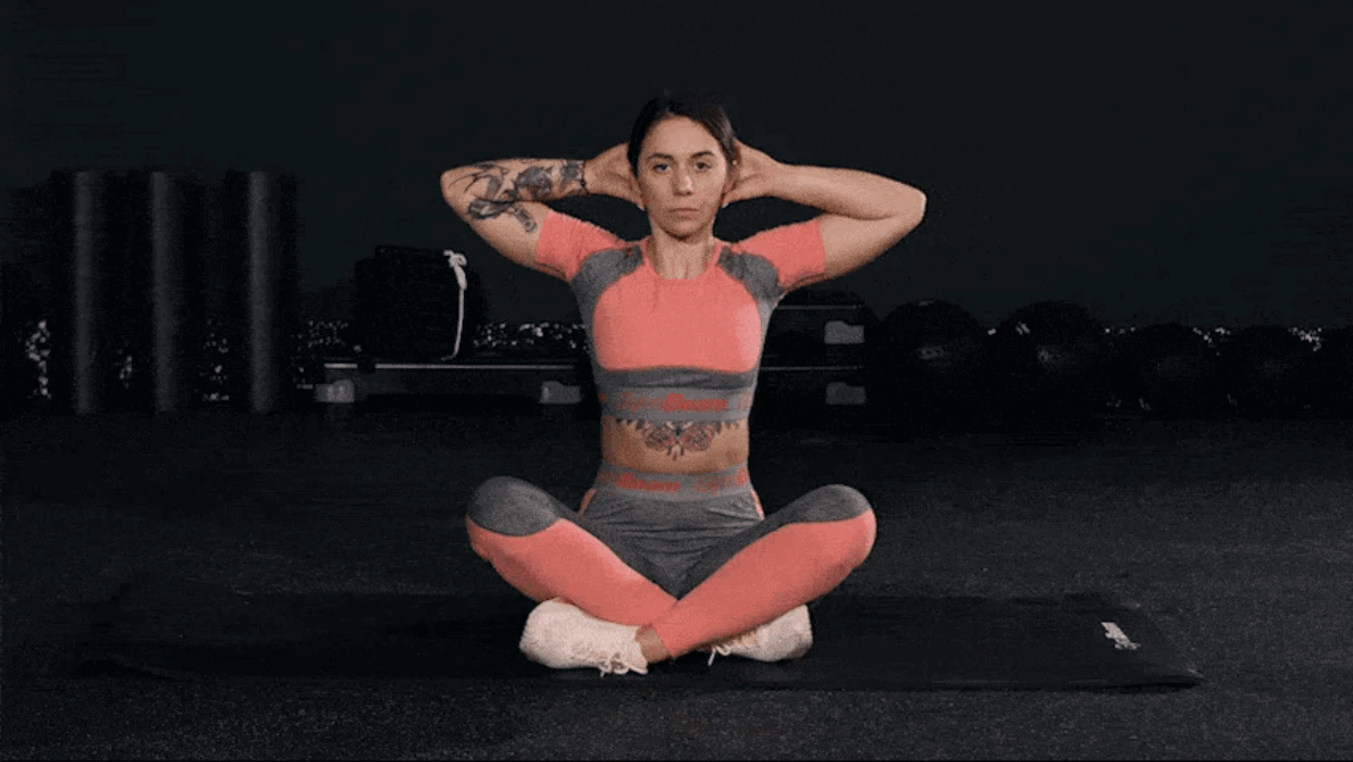 2. Nyújtsuk ki a karokat felfelé, és tegyük a tenyeredet tarkódra összefont ujjakkal. A könyökök a testtől ellentétes irányba mutassanak.
