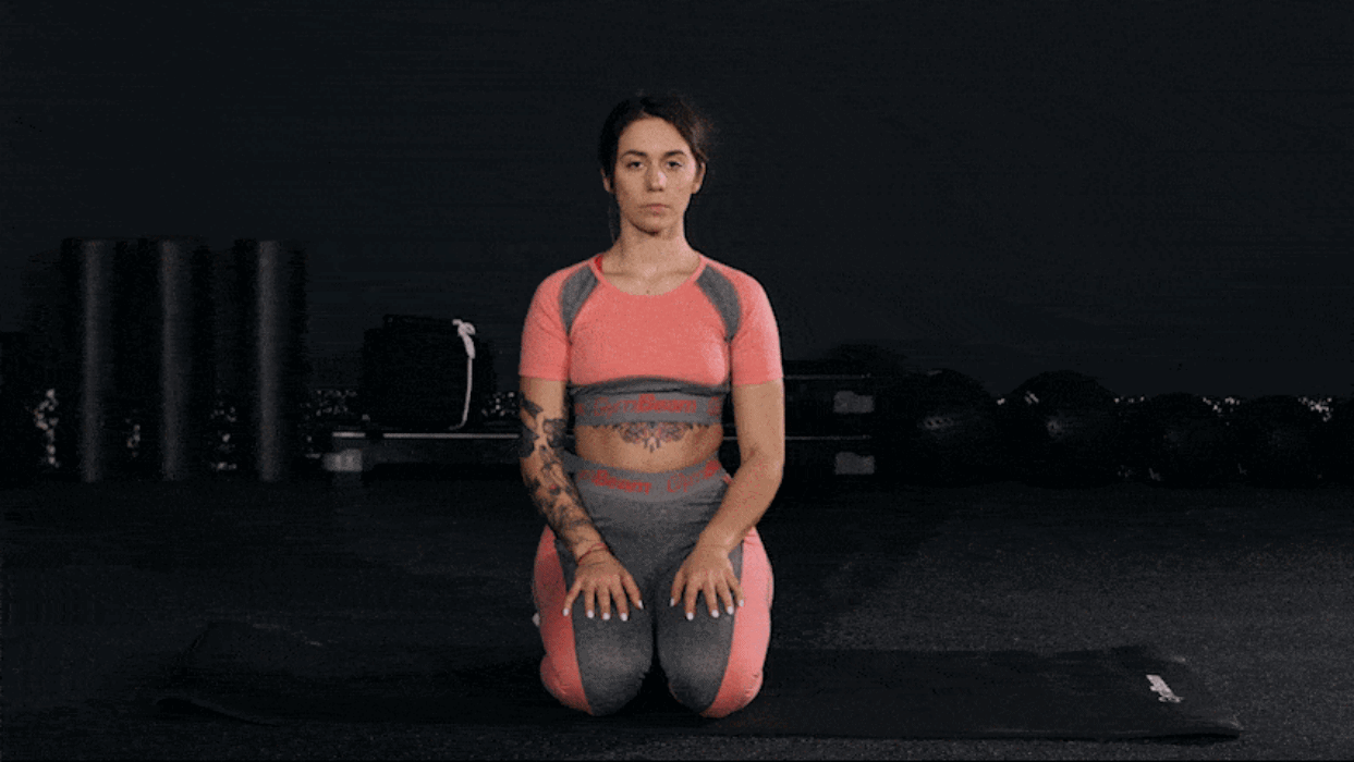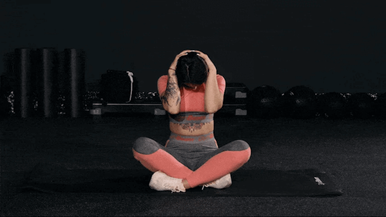 3. Döntsük előre a fejet a mellkas irányába, és húzzuk össze a könyöködet. Kilégzés közben enyhén domborítsuk a hát felső részét.