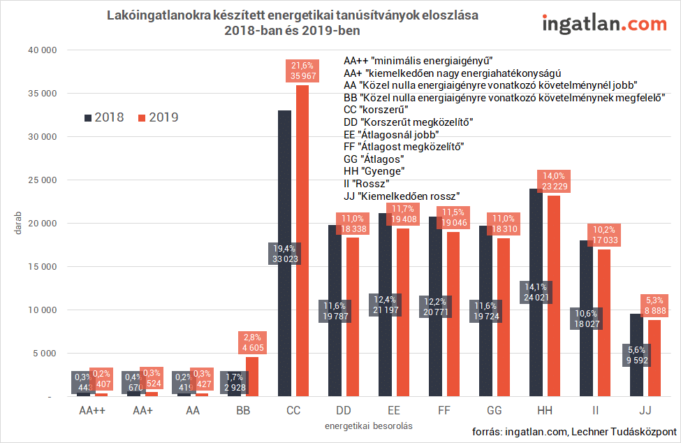 Balogh László, az ingatlan.com vezető gazdasági szakértője azt mondta, hogy az energiatanúsítvány teljesen objektív, jogszabályokban leírt kritériumok alapján határozza meg egy-egy ingatlan energiafogyasztását. A legjobb osztályzat az AA++, a legrosszabb pedig a JJ, előbbiek “minimális energiaigényűek”, utóbbiak “kiemelkedően rosszak”. “Az adatok értékelésénél fontos tisztázni, hogy nem ugyanazok a lakások kaptak osztályzatot 2018-ban és 2019-ben, de az látható, hogy az összes adásvételre vetítve minimális mértékben nőtt az energiatakarékosabb lakások szerepe” – mondta Balogh László.