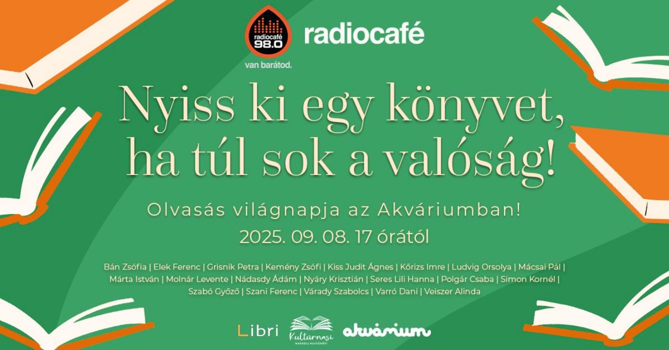 Szeptember 8-án, hétfőn a radiocafé és a Kultúrnasi ismét megrendezi az olvasás világnapját, az Akvárium Klubban. Az idén kerekasztalbeszélgetések, improvizatív színházi produkció és Dalnokverseny várja az odalátogatókat. Az esemény házigazdája Veiszer Alinda lesz, a rendezvény látogatása ingyenes.
