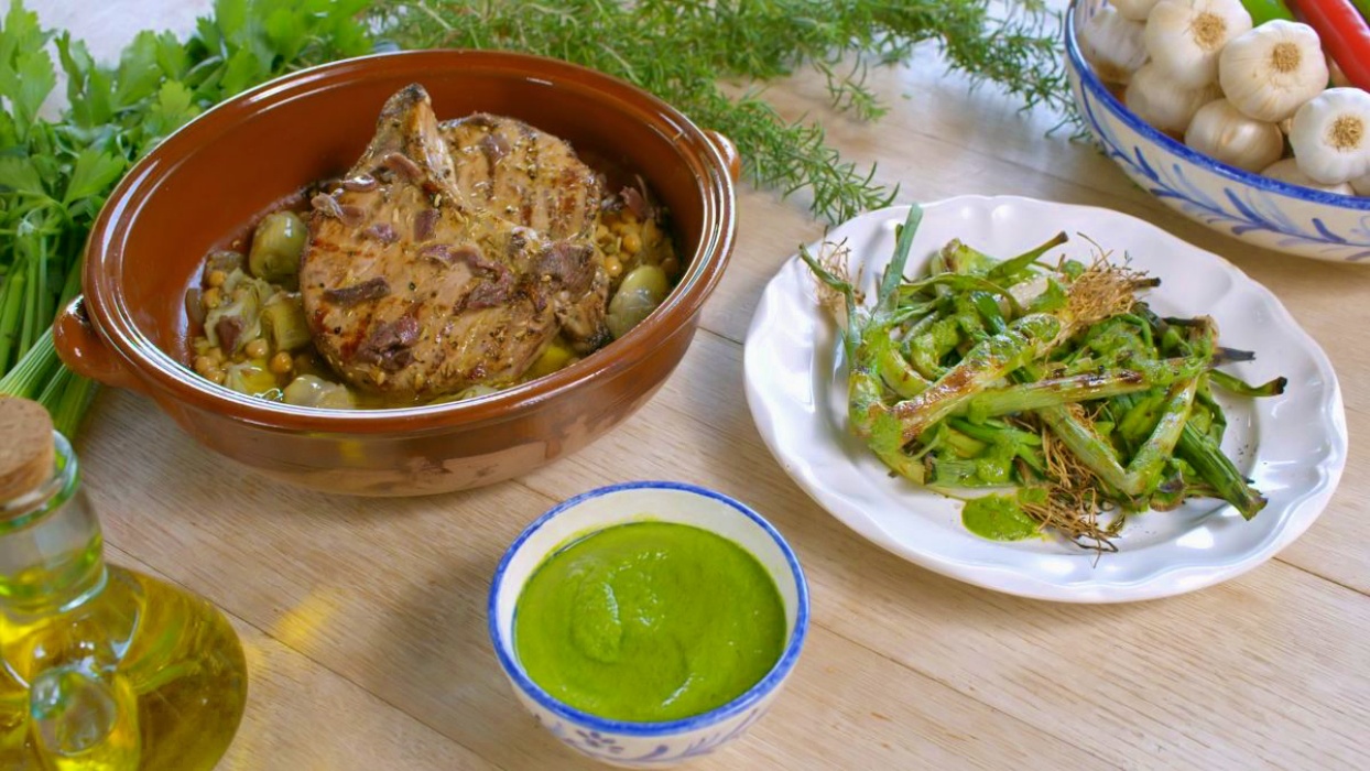 - Tálalás: Ha szükséges, melegítsd újra az alaplevet, majd öntsd egy tálalóedénybe, és helyezd rá a karajokat. Az újhagymát rendezd a tányérra fészek formában. Locsold meg salsa verdével. Az újhagymát és a karajt is csepegtesd meg egy kevés olívaolajjal, tekerj rá egy kis sót és borsot, majd díszítsd a szardellaszeletekkel.