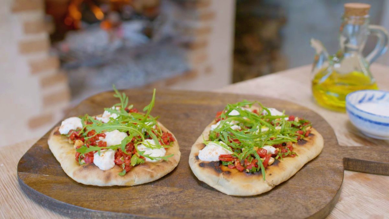 - Szórd meg a meleg laposkenyereket az aprított piros paprikával és a pörkölt kesudióval. Kanalazd rá bőven a burratát, szórd meg rukkolával, majd tálalás előtt hintsd meg egy kevés pirospaprikával.