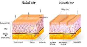 „Az öregedés során a bőrünkben számos szövettani elváltozás zajlik. A felhám elvékonyodik, a ráncok mélyén sorvadás mutatható ki, csökken a bőrt tápláló erek száma, a rugalmasságot és feszességet biztosító rostok szerkezete felbomlik, és a mennyiségük is csökken. A kollagén csökkenésével kialakulnak a ráncok, a bőr pedig veszít a feszességéből. Ennek egyik oka az, hogy a cukor biokémiai folyamatok során a kollagénhez kötődve olyan szerkezetbeli változásokat idéz elő, ami során az merevebb és rugalmatlanabb lesz. A folyamat során keletkező káros molekulák ezen kívül oxidatív stressz révén szabad gyököket szabadítanak fel, amelyek hatására a kollagén széttöredezik” – mondja a szakember. Az elasztin is felelős a bőr rugalmasságáért, melynek mennyisége az öregedés során szintén folyamatosan csökken. „A külső károsító tényezők, mint például az UV-sugárzás hatására megnő az elasztint lebontó elasztáz nevű enzim mennyisége, ami elasztózishoz (a rugalmas szövetek degenerációjához), így a bőr fokozottabb és gyorsabb öregedéséhez vezet” – részletezi Dr. Parrák Zita.