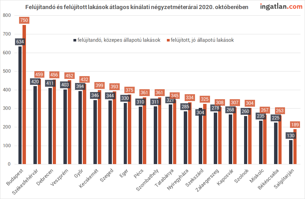 Vagyis a jobb állapotúak 18 százalékkal drágábban szerepelnek a jelenlegi kínálatban. A vidéki nagyvárosokban is jelentősek a különbségek.