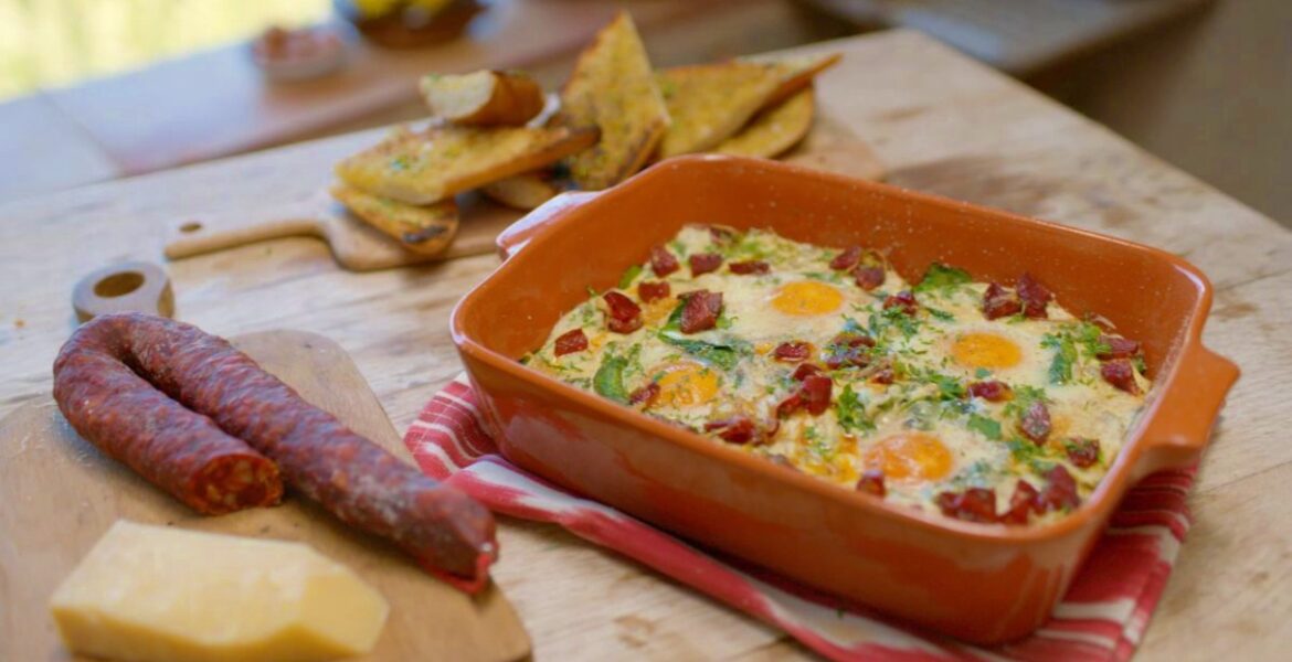 - Tálalás: A tojásokat díszítsd a chorizóval, még egy kevés szerecsendióval és friss petrezselyemmel. Tálald a pirított bagettel.