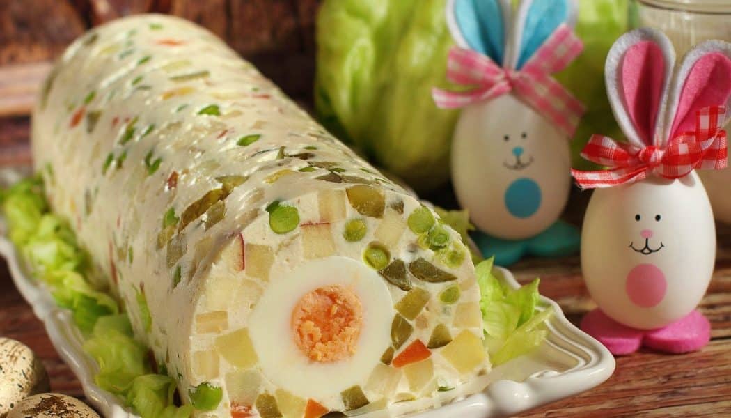 A megtisztított zöldségeket, az ecetes uborkát és az almát borsó nagyságú kis kockákra vágjuk. A zöldségeket sós vízben puhára főzzük. Leszűrjük, kihűtjük. A majonézhez keverés közben, lassan, kisebb adagokban, vékony sugárban hozzácsorgatjuk az olajat a ToTu Krémhez. Ha majonéz állagúvá válik, ízesítjük citromlével, mustárral, eritrittel, törött borssal. A sóval és a fűszerekkel nyugodtan bánjunk bőkezűen. Akkor lesz a végén finom a salátánk, ha a majonéz kissé túlfűszerezett. Hozzákeverjük a forró vízben feloldott zselatint. Összeforgatjuk a zöldségekkel, az uborkával és az almával, majd háztartási fóliával vagy szilikonlappal bélelt alagút formába töltjük a saláta harmadát. Rárakosgatjuk a tojásokat, végül ráöntjük a maradék salátát. Elsimítjuk a tetejét. Befedjük fóliával, és minimum 3 órára, de még jobb, ha egész éjszakára hűtőszekrénybe tesszük dermedni. Sonka, csülök, füstölt tarja mellé remek köret.