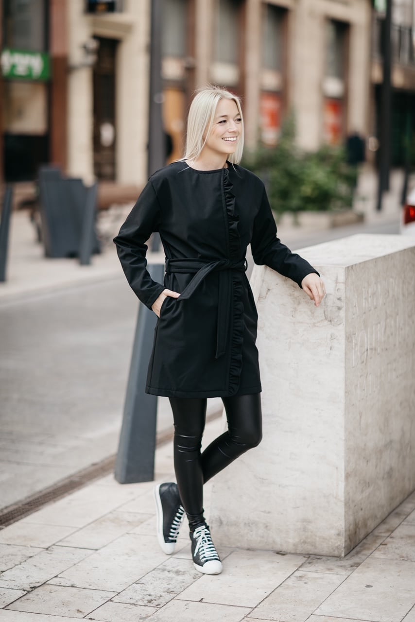 A kollekció truly black, 100% fekete modelljeihez a tervezők kasmír szövettel és soft shell anyaggal dolgoztak. (OEKO-tex standart 100 bevizsgált minősitésűek). A kevert gyapjú vagy gyapjúkasmir oversize modellek keleti letisztultságát esetenként finom fodrokkal vagy dupla, sötétszürke tűzésekkel lágyítják-gazdagítják. A soft shell fonákján polár, színén vízlepergető anyagát a kollekcióban nem csak kabátok, de ruhák alapanyagaként is újragondolják.